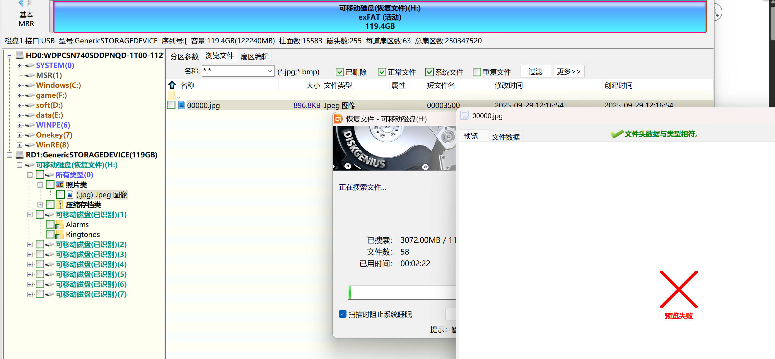 近期,我在某平台上租了一台Ace Pro 2,想着和action5pro对比一下,看看谁拍的视频更加讨喜。然后商家给了我一张128G的TF卡。我抱着试一试的心态,使用最常用的数据软件diskgenius去恢复一下,看下上一个租客的数据是否清洁到位。结果一恢复,恢复出了较多的图片和视频,并且还是恢复进度到了百分之三十左右的样子。一些照片和视频就已经可以正常观看了。
